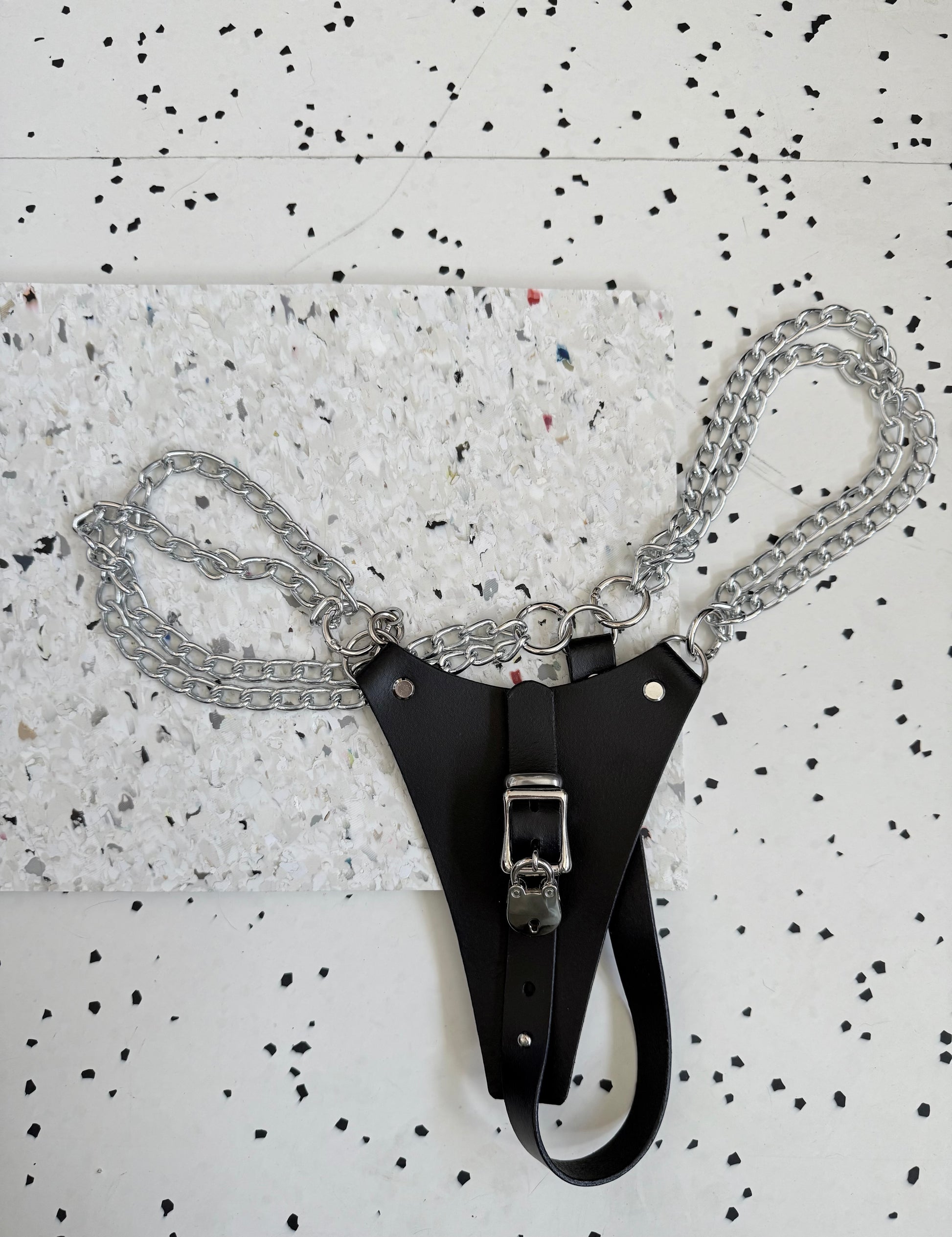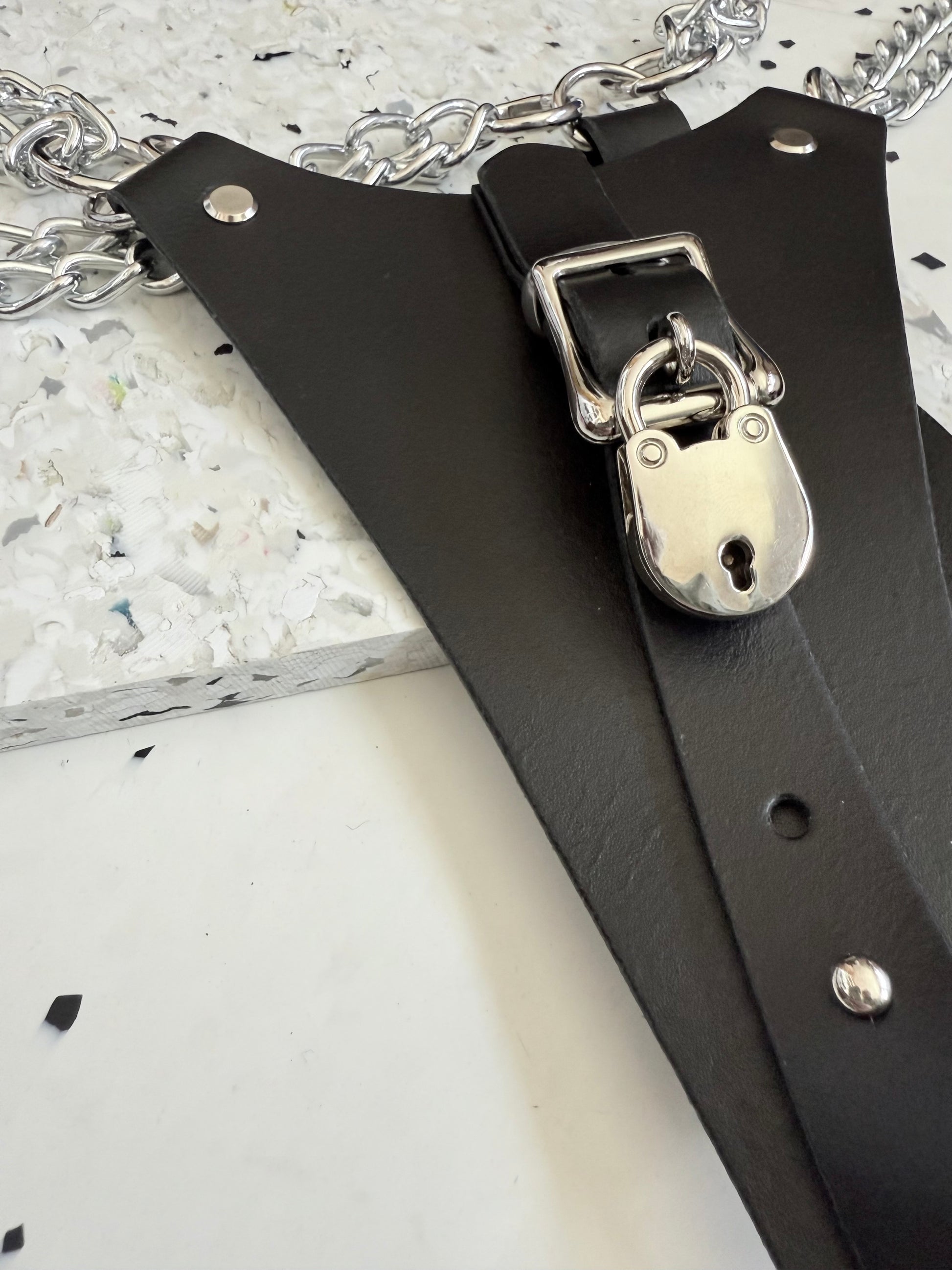 Chain straps to sit high on the hips, clip hoop release at back for quick removal (if you lose your key for the front).